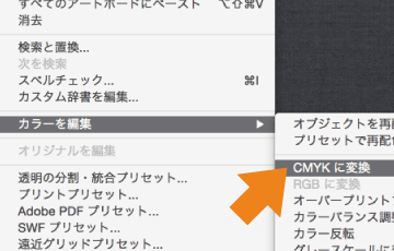 メニューから「選択」→「すべてを選択」をクリックします。オブジェクトがすべて選択された状態のまま、メニューから「編集」→「カラーを編集」→「RGBカラーに変換」もしくは「CMYKカラーに変換」をクリックします。