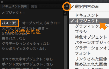 「ドキュメント情報」のオプションから「オブジェクト」を選択します。「パス」を確認して2000以上ならラスタライズ(画像化)する必要があります。