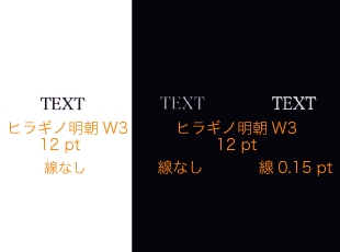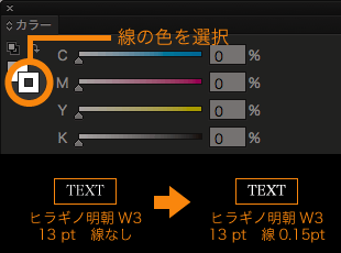 テキストオブジェクトを選択し、塗りと同じ色で線を付けてください。このとき、「少し太いかな?」と感じるくらいが目安です。